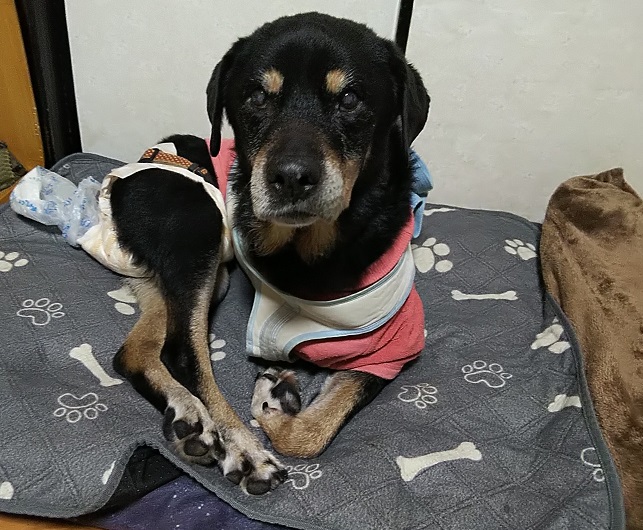 2021年に骨肉腫で右腕断脚し、その後は転移も無く元気に過ごしておりましたが、先月10月に後ろ左足が動かなくなり受診して、再びの骨肉腫が判明。すでに3本足の為、外科処置は出来ず現在は痛み止め服用にて介護中。